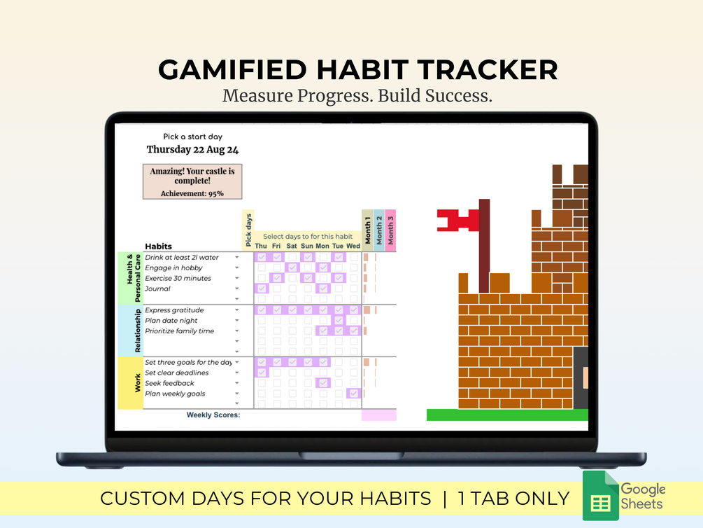 10 leftHabit Tracker Spreadsheet for Google Sheets, Custom Days to Track Each Habit, Level Up Your Habits with Gamified Features, Easy-to-Use.