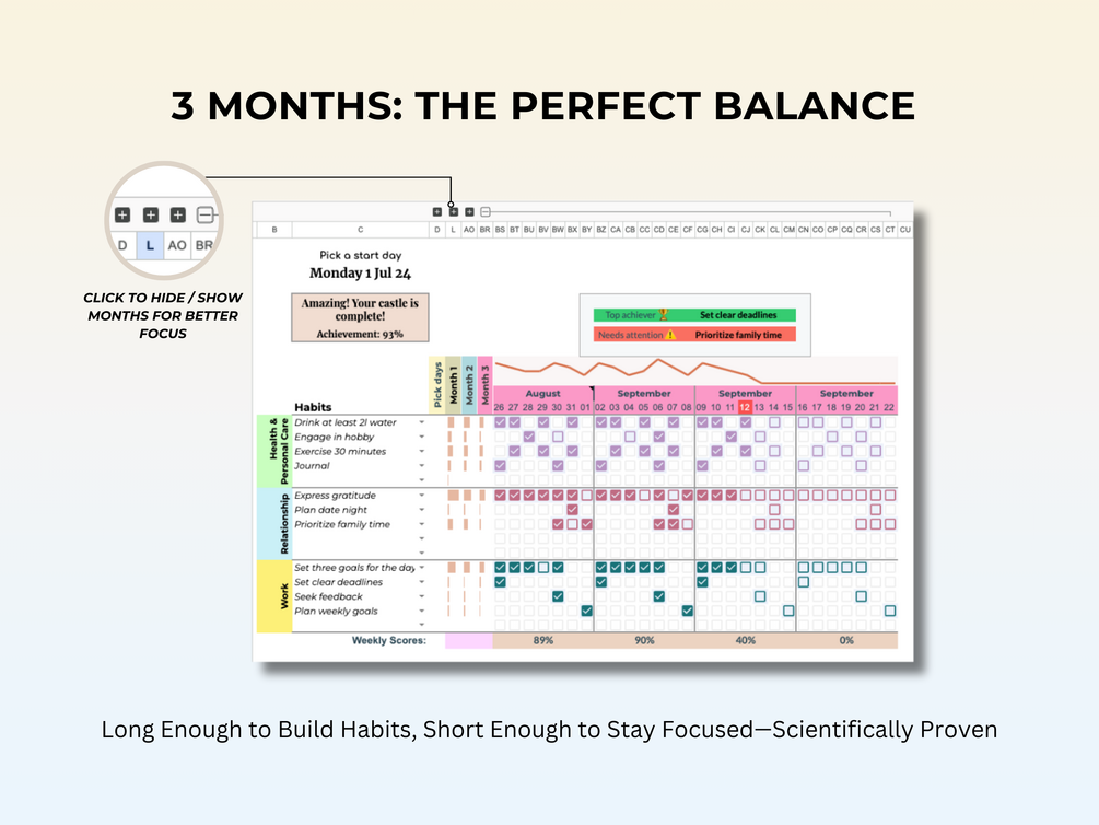 With a focused 3-month approach, it strikes the perfect balance of time. Research shows it takes 66 days for a new behavior to become automatic. Track up to 15 habits across 3 key categories that encompass all aspects of life. Simple, realistic, and achievable.