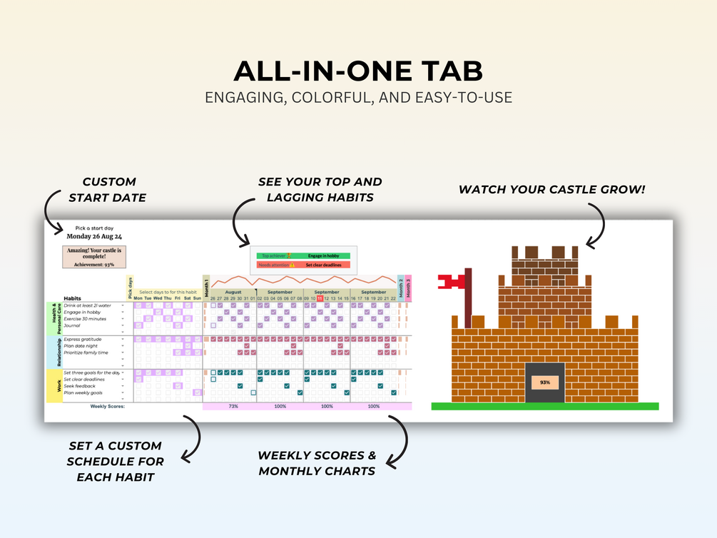 Habit Tracker Spreadsheet for Google Sheets, Custom Days to Track Each Habit, Level Up Your Habits with Gamified Features, Easy-to-Use.